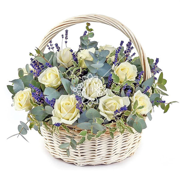 роза белая (кремовая) – 11 шт., лимониум фиолетовый, эвкалипт, питтоспорум, оазис, корзина