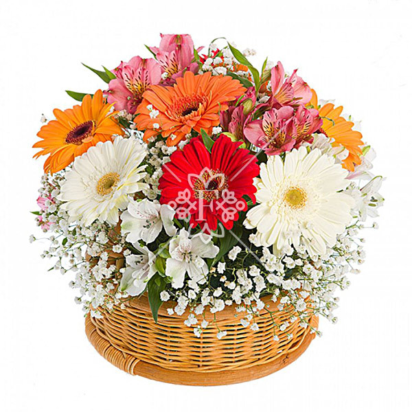 гербера красная, оранжевая, белая (кремовая) – 7 шт., альстромерия розовая, белая – 6 шт., зелень декоративная (гипсофила), оазис, корзинка